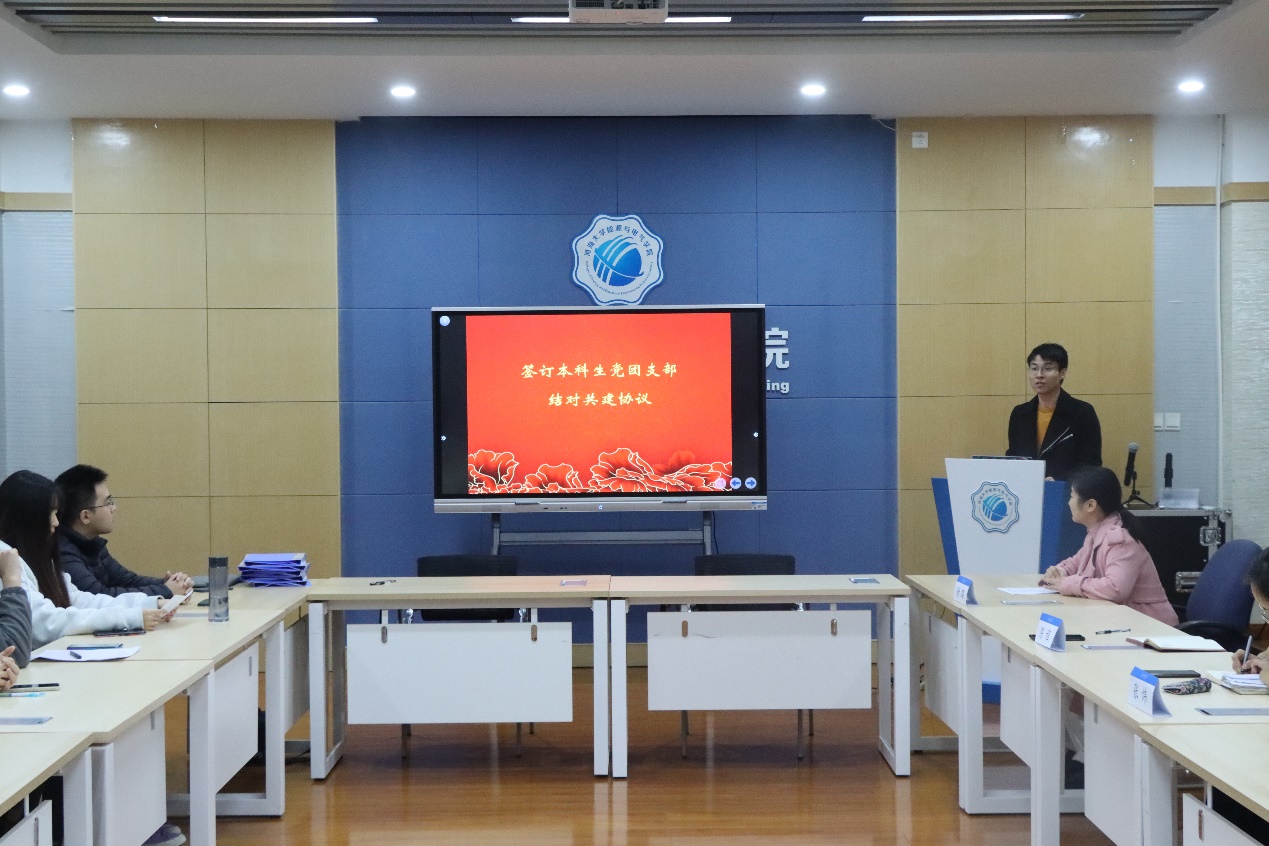 结合党支部团支部组织建制和专业特色方向等实际情况,本科生5个党支部与21级、22级团支部签订结对共建协议书。本科生第四党支部书记陈程老师宣读共建内容,确定结对党团支部每学期至少共同组织1次专题学习会,开展1次主题党日团日活动,开展1次“我为师生做实事”活动。