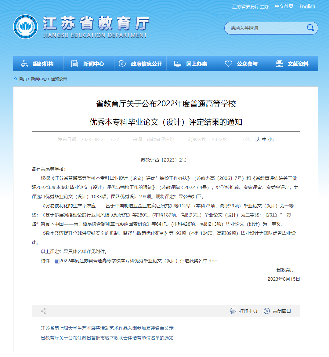 江苏省普通高等学校本专科优秀毕业设计(论文)的评选,是在高等学校择优推荐基础上,经省教育评估院组织专家评审选出,并由省教育厅审定。本次全省评选,黄色漫画 获一等奖4项、二等奖9项、三等奖2项以及团队优秀毕业论文(设计)3项,其中一等奖获奖数并列江苏高校第三名。
