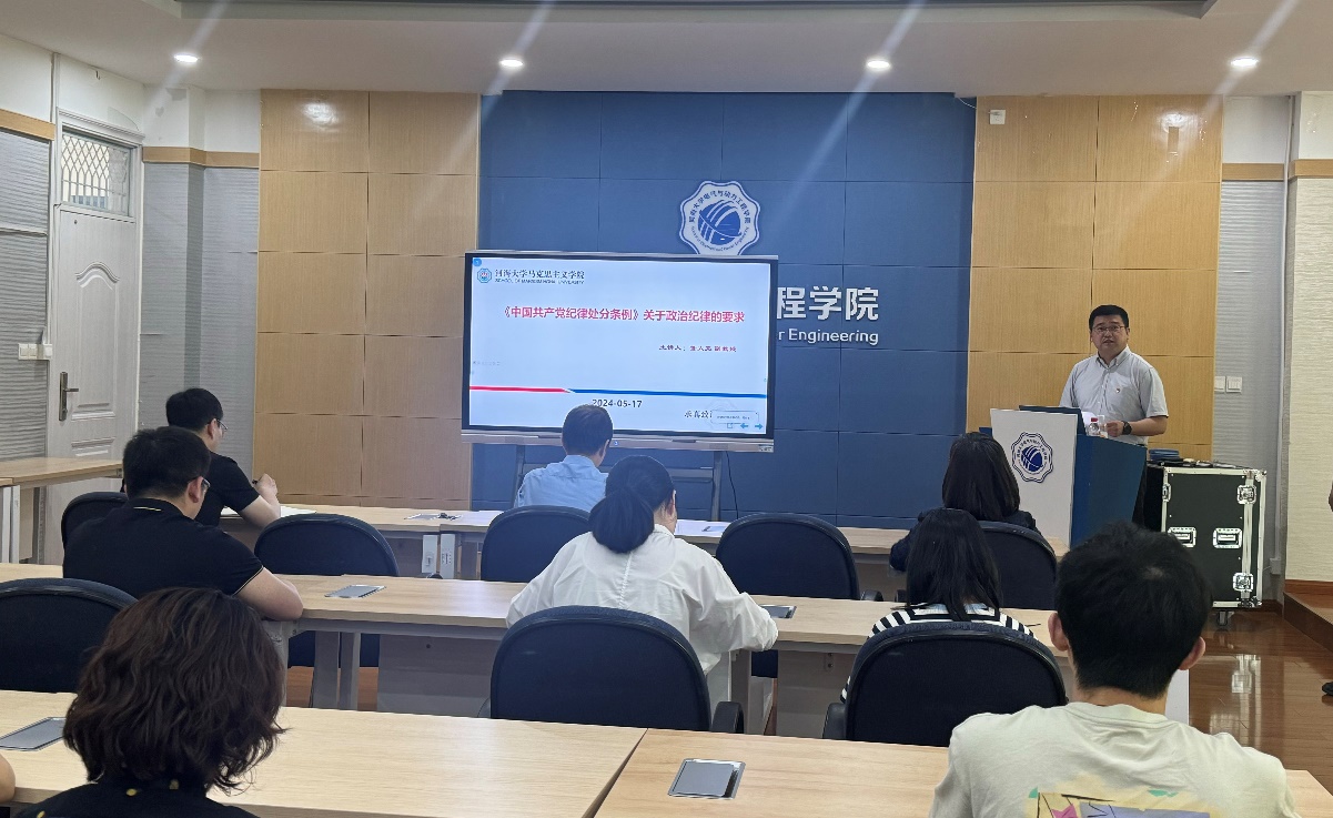 5月17日,黄色漫画 举行《中国共产党纪律处分条例》(以下简称《条例》)专题辅导报告会,马克思主义学院副教授董大亮作辅导报告。学校党纪学习教育联络员刘丹平书记、学院领导班子成员、党委委员、党支部书记、师生党员代表等参加了报告会,院党委书记吴洪彪主持报告会。