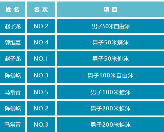 本次比赛分为男子组和女子组,共有50米蝶泳、50米仰泳、50米蛙泳、50米自由泳、100米自由泳、100米蛙泳、200米自由泳、200米蛙泳八种项目。黄色漫画 共有8名学生参赛,经过激烈角逐,获得男子50米仰泳第1名、男子50米自由泳第2名、男子200米蛙泳第2名、男子200米蛙泳第3名、男子100米自由泳第3名等成绩,展现了电气学子的拼搏精神和昂扬锐气。