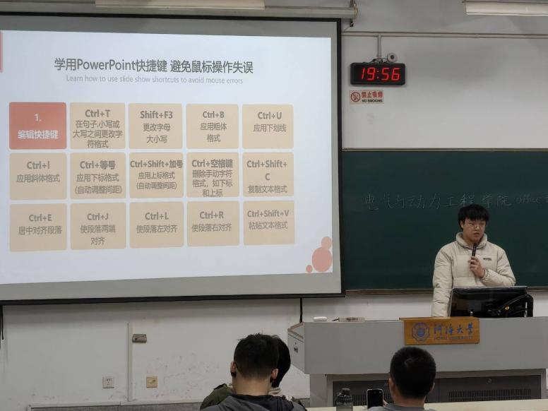 最后,由科协综合部副部蒋春旺讲解PowerPoint的使用技巧。他以汇报制作与演示技巧为核心,讲解PowerPoint简洁设计、字体嵌入、多媒体插入等实用技能,助力同学们在课堂展示、活动宣讲、竞赛答辩中呈现更专业的效果。